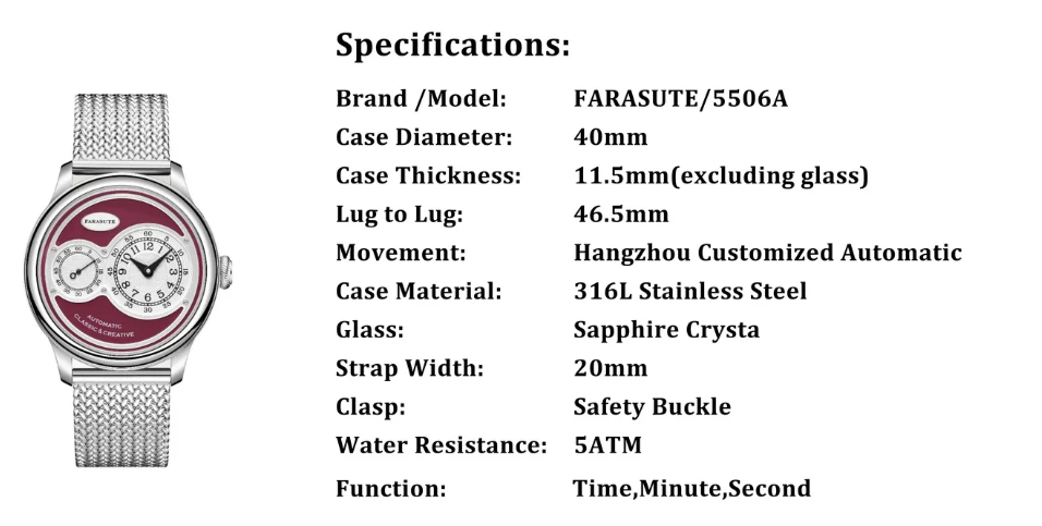 FARASUTE Men’s Automatic Watch. 40mm. Mechanical. Sapphire. Enamel Dial. Small Second Dial