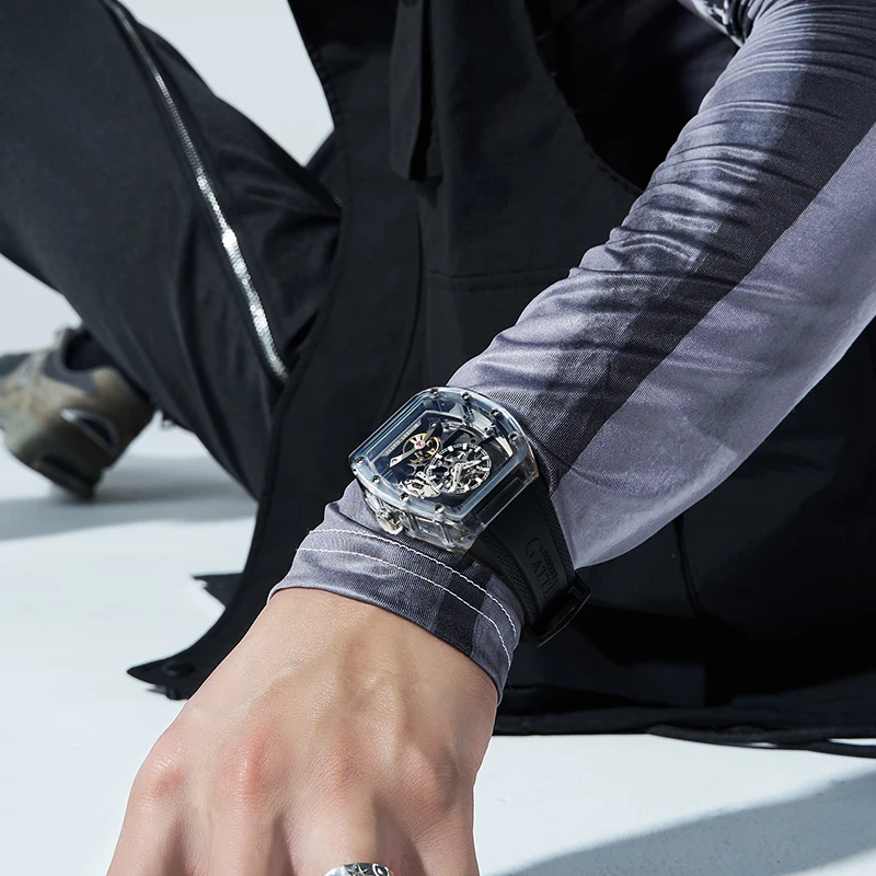 Discover the BONEST GATTI watch, a sleek tonneau-shaped timepiece with a black rubber band and automatic self-wind movement, encased in durable K9 crystal.