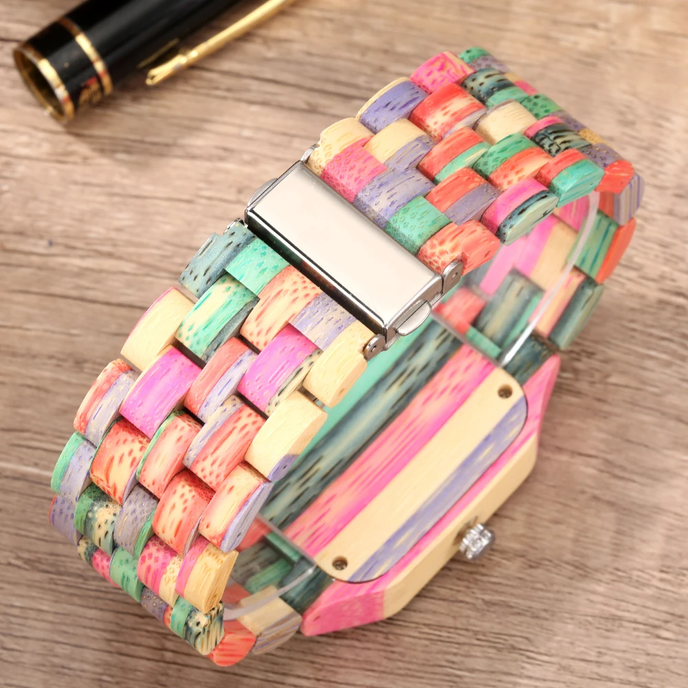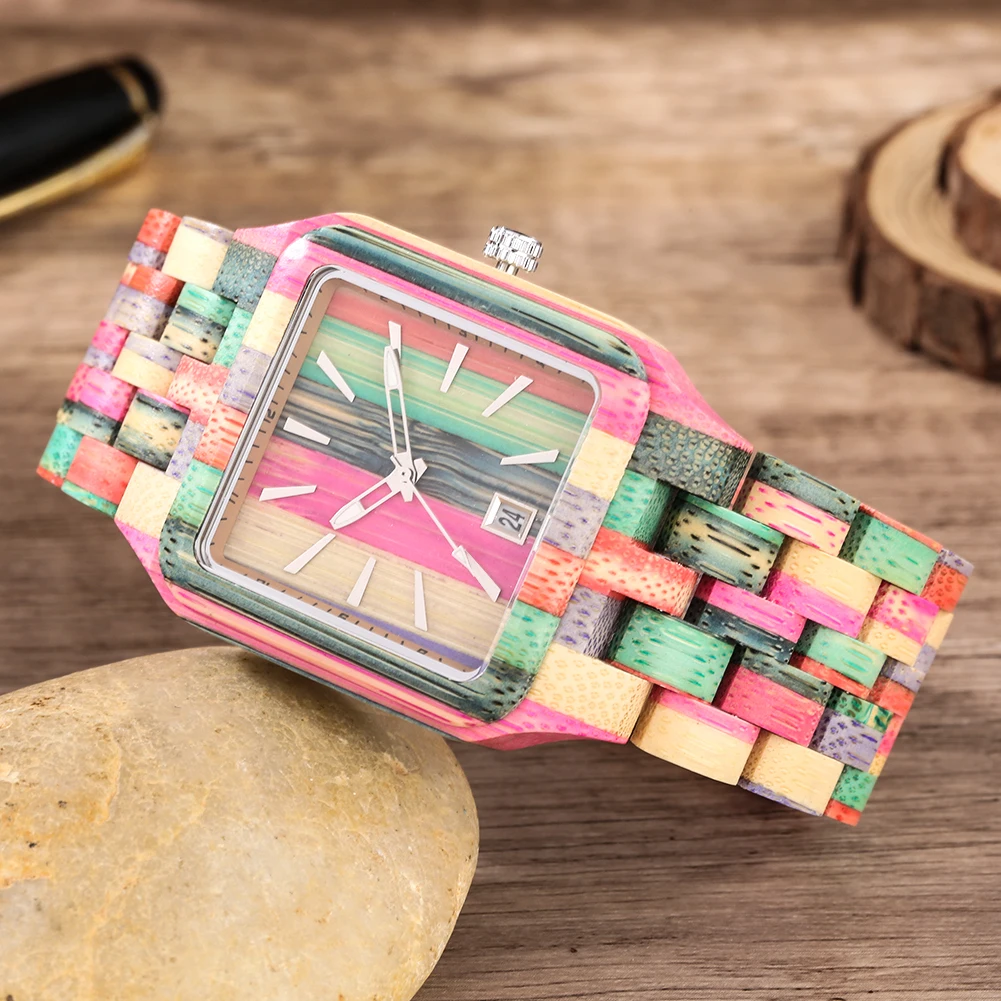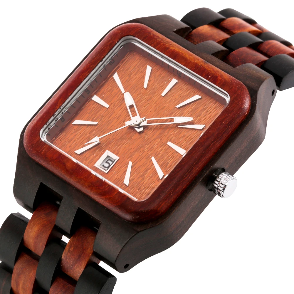 Buy Calendar Minimalist Square Dial Colorful Bamboo/Ebony/Red Wood Quartz Men Watch Folding Clasp Full Wooden Bracelet Band
