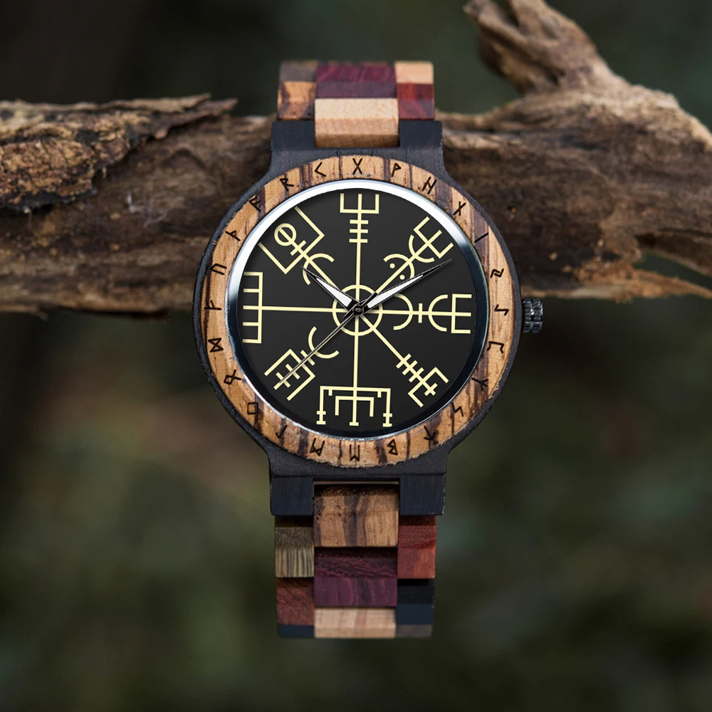 Buy Viking Wooden Men Watch Top Japanese Quartz Movement Wristwatch with Helm of Awe Runic Circle Fashion Gift Box