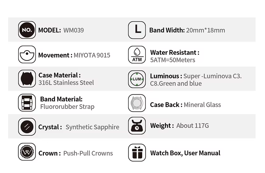 WM Automatic Mechanical Men’s Watch. Miyota9015. Stainless Steel. Sapphire. Water Resistant. Welly Merck Watch WM039